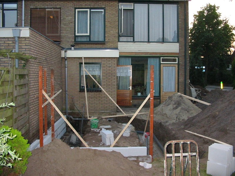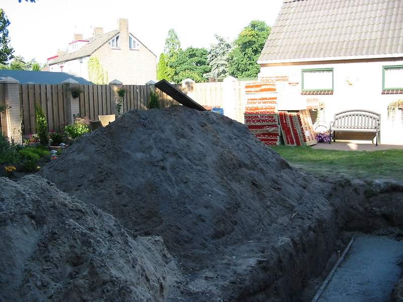 Ook voor de keuken is begonnen met de fundering. Het uitgegraven zand ligt in de tuin.