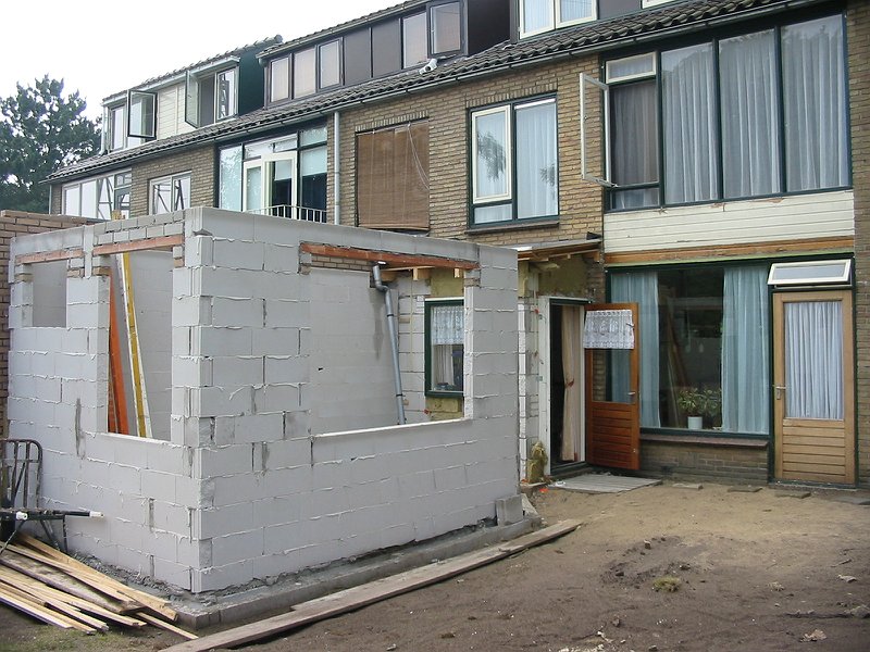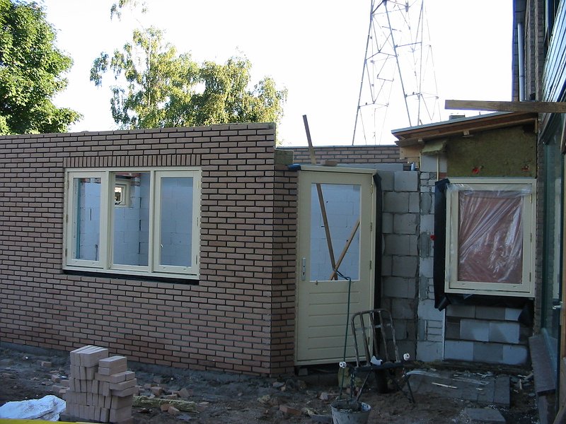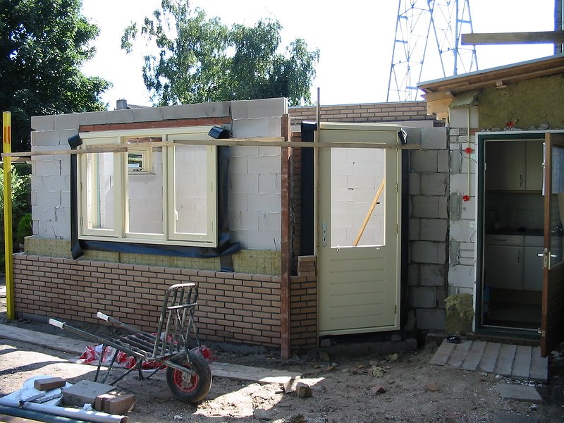 De kozijnen zijn geleverd, dus er is begonnen met de buitenmuren van de bijkeuken.