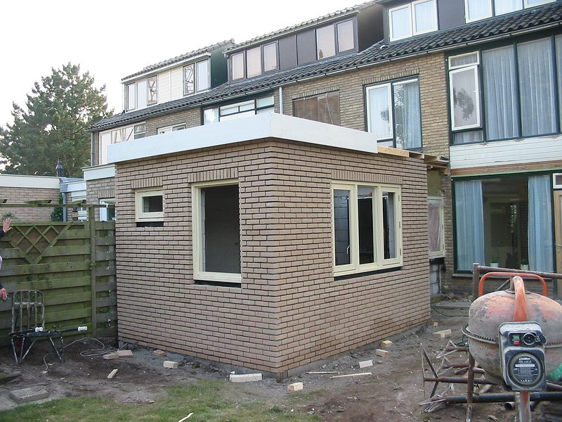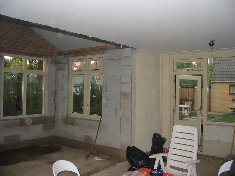 Het dak zit op de aanbouw, dus de tussenmuur kan weggebroken worden.