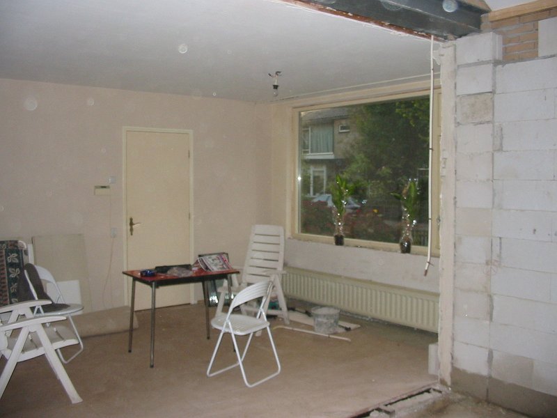 Een laatste blik in de woonkamer met de zijmuur er nog in.