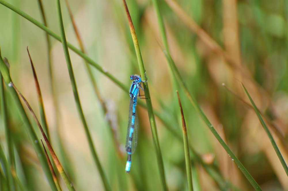 Een mooie blauwe libelle aan de waterkant.