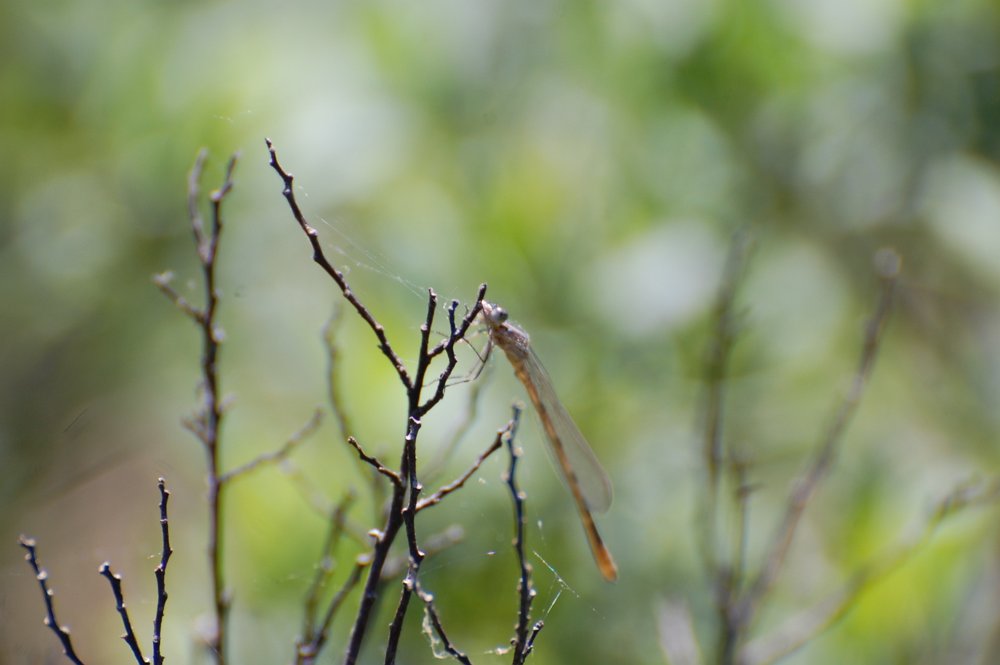 Allerlei soorten en kleuren libelles kun je vinden. zoals dit kleine bruine exemplaar.