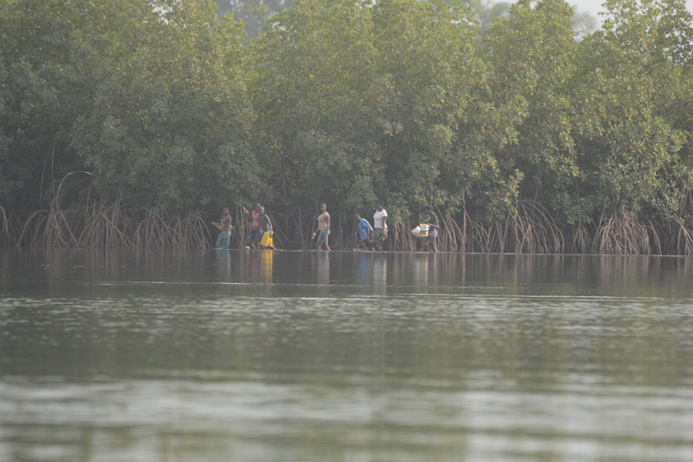 Vrouwen lopen door het water naar hun werk om oesters te steken.