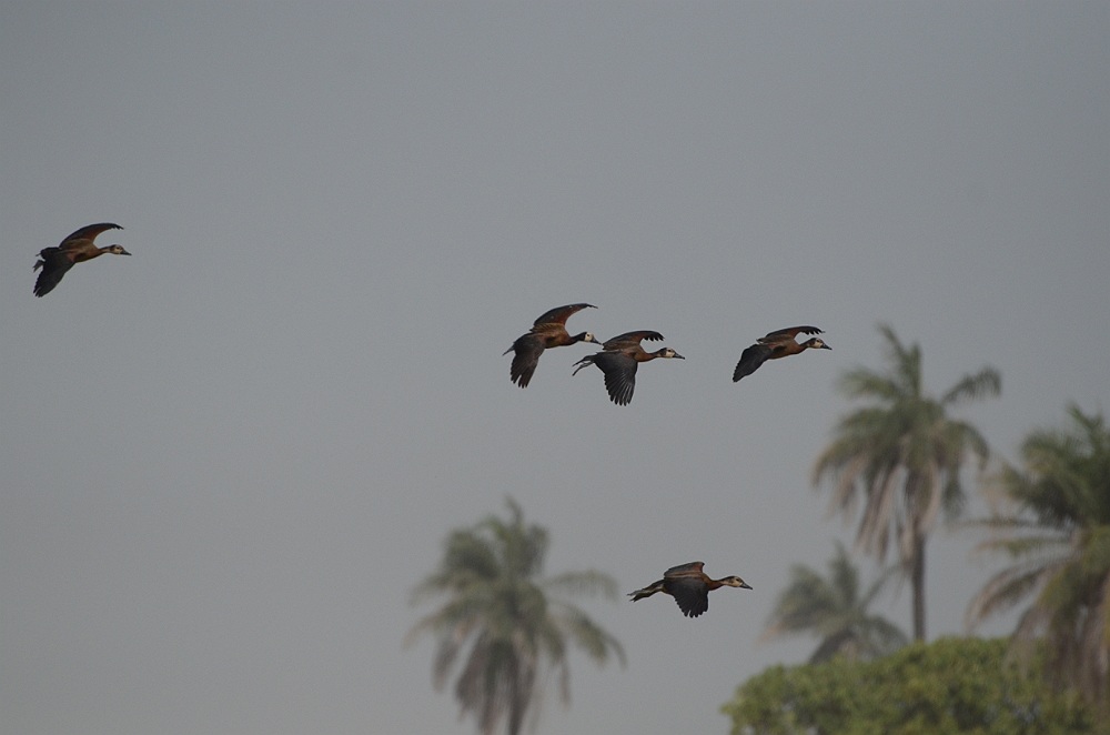 Witwangfluiteenden in de vlucht.
