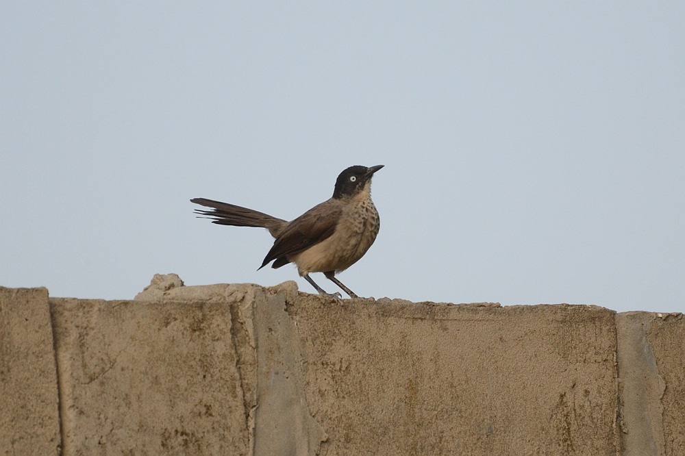 Blackcap Babbler op een muurtje van de tuin.