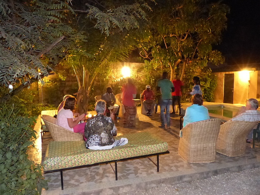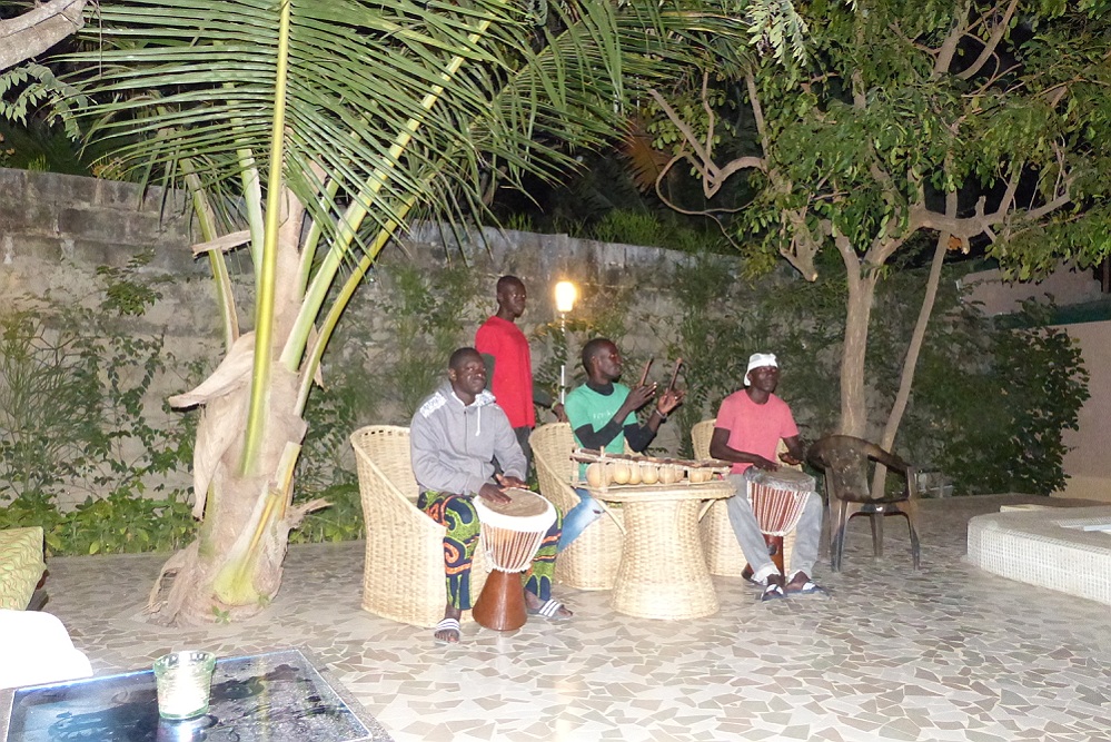 De mannen van de lodge maken gezamenlijk muziek voor ons. Gasten worden geacht mee te doen.