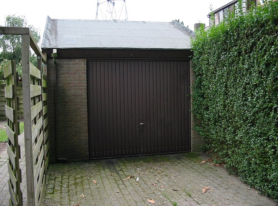 Langs de garage zie je achterin de tuin ons schuurtje staan.
