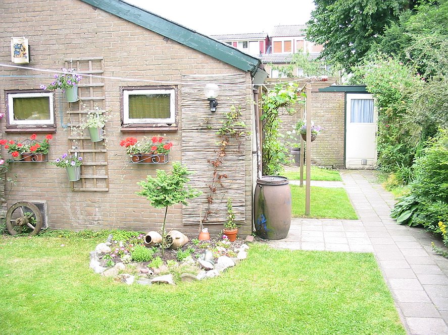 De garage ziet er aan de tuinzijde toch leuk uit.