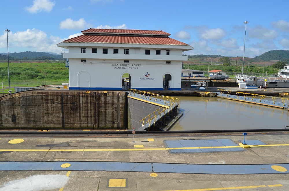 Een oud marineschip passeert de sluizen in de richting van de Caribische zee.