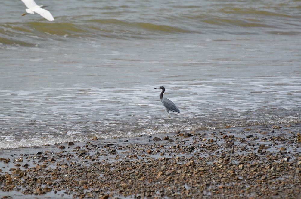 Grote blauwe reiger in zee met overvliegende witte reiger.