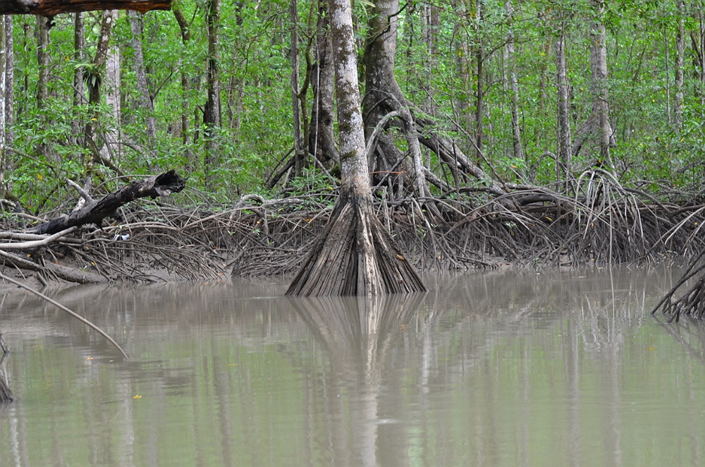Op de modderige wortels zie je de waterhoogte.