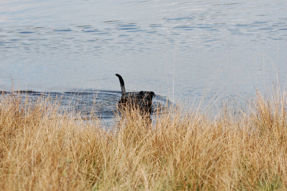 De kortste weg van het vrouwtje naar het baasje is natuurlijk dwars door het water.