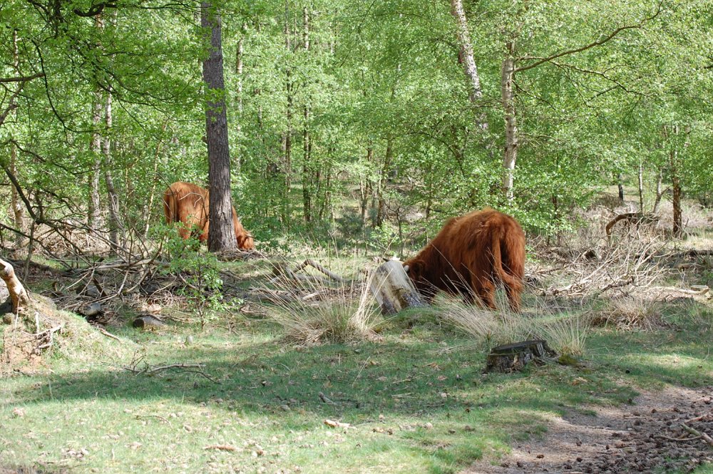 In de bossen achter de camping lopen diverse Schotse Hooglanders vrij rond.