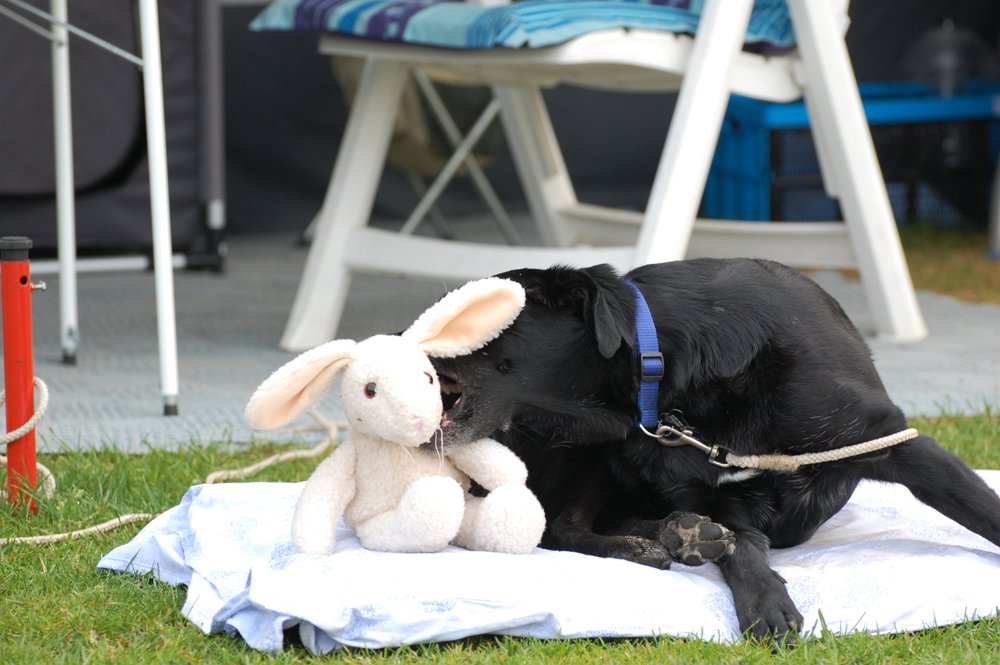 Senna heeft op de vrijmarkt een speelgoedkonijn gekregen. Het was afwachten hoe lang deze heel zou blijven.