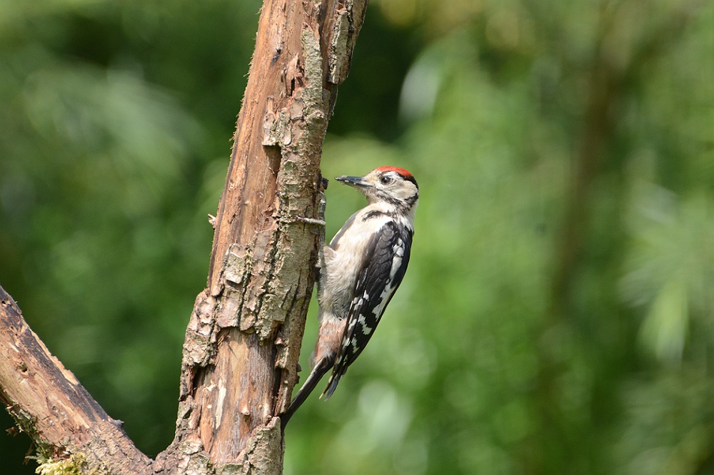 Grote bonte specht juveniel. Herkenbaar aan de rode kop