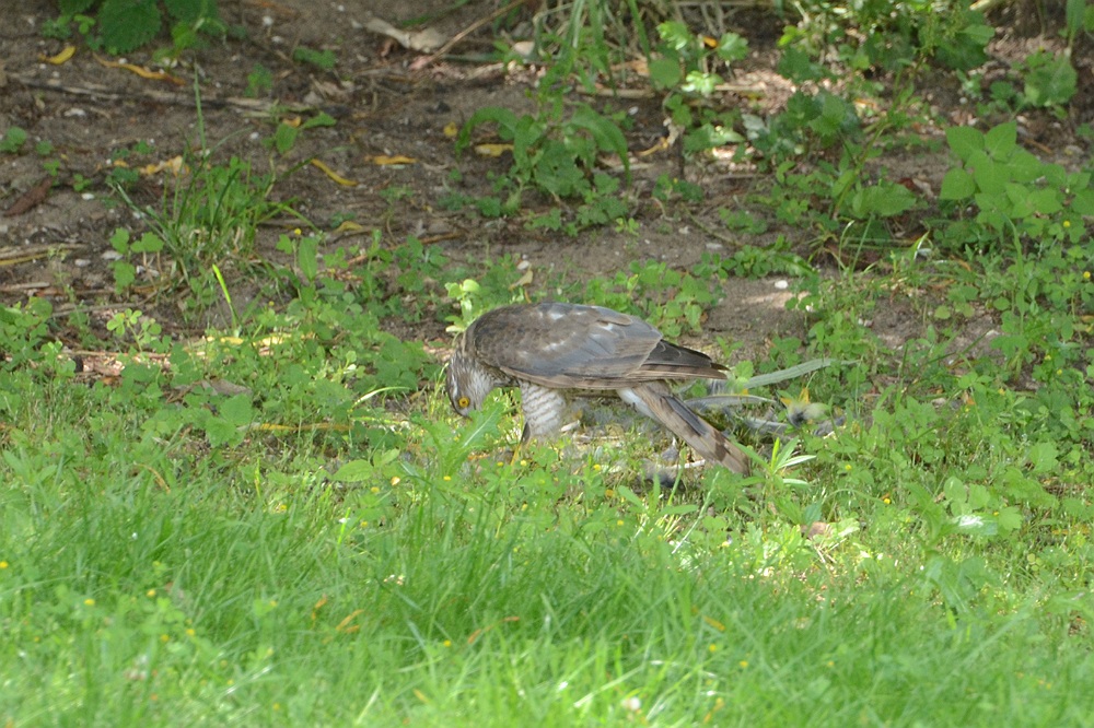 Een valk verorberd vlak voor de hut zijn prooi.