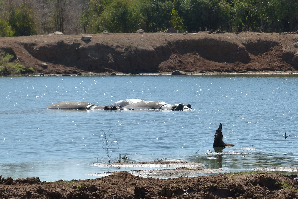 Nijlpaarden in de waterplas op de lodge.