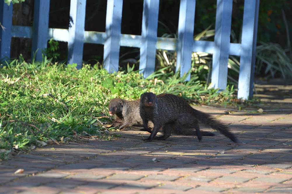Banded Mongoose lopen door de tuinen.