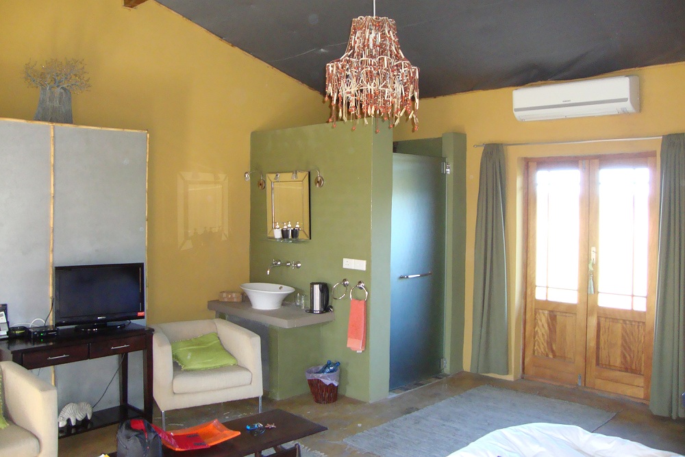 De zithoek van onze kamer met in de hoek de douche.