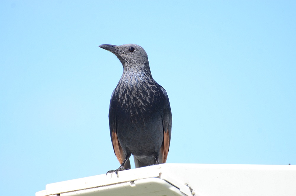 Op de parkeerplaats bij de brug zitten een aantal brutale Red-winged Starlings.