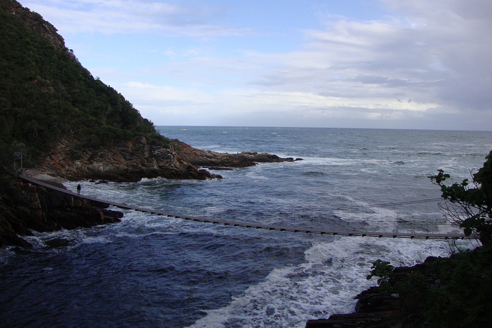 Beneden ons zien we de bekende hangbruggen van Tsitsikamma.