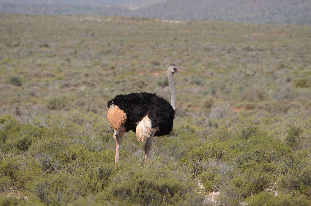 Langs een rustige weg zien we de Blue Crane, de zeldzame nationale vogel van Zuid Afrika.