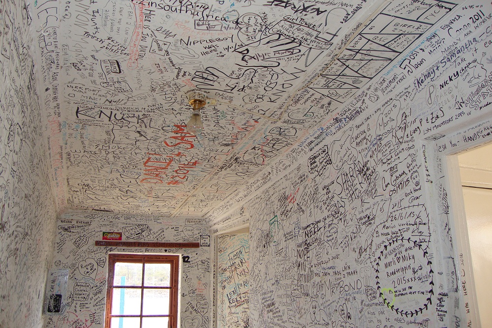Plafond en muren van een derde ruimte zijn volgeschreven met boodschappen en handtekeningen.