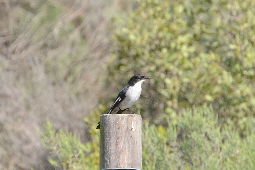 In een struik langs de weg zit een Yellow Bishop.
