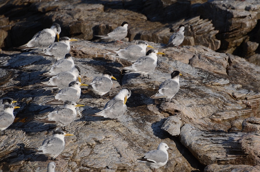 Op de rotsen zitten tientallen Swift Terns.