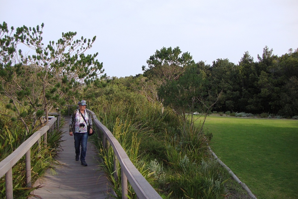 Door een aangelegde moerastuin loopt een houten vlonderpad.